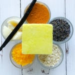 (Sodio coco-isetionato, sodio Coco Solfato, olio di riso, cera d’api, burro di cacao, amido di riso, acqua, althaea officinalis, oli essenziali, curcuma, alcool benzilico, acido deidroacetico)